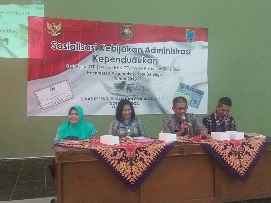 Pada hari Selasa, 20 Agustus 2019 pukul 13.00 WIB bertempat di Aula Kelurahan Tegalrejo Kecamatan Argomulyo Kota Salatiga, diadakan Sosialisasi Kebijakan Kependudukan yang diselenggarakan oleh Dinas Kependudukan dan Pencatatan Sipil Kota Salatiga. Acara Ini diselenggarakan bertujuan untuk mensosialisasikan Peraturan Peraturan Kependudukan yaitu imlpemntasi Peraturan Pemerintah No. 40 Tahun 2019 tentang Pelaksanaan Undang Undang Nomor 23 Tahun 2006 tentang Administrasi Kependudukan sebagaimana telah diubah dengan Undang Undang Nomor 24 Tahun 2013 tentang perubahan atas Undang Undang nomor 23 Tahun 2006 tentang Administrasi Kependudukan.